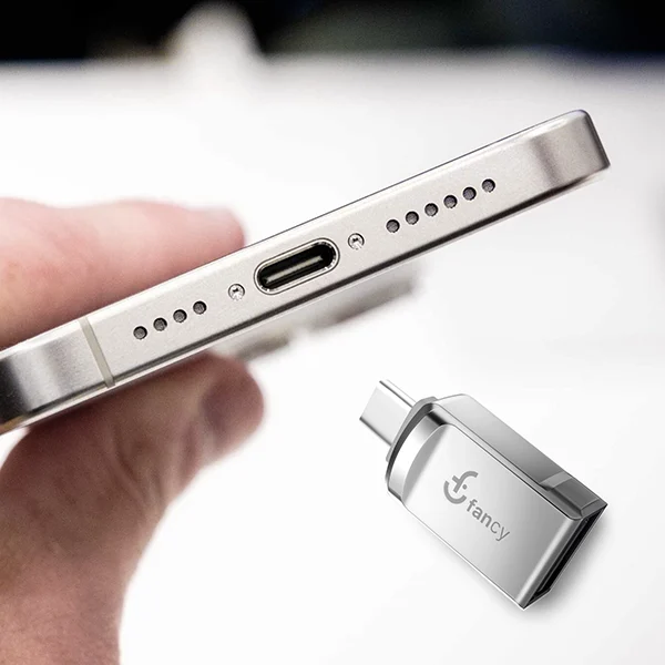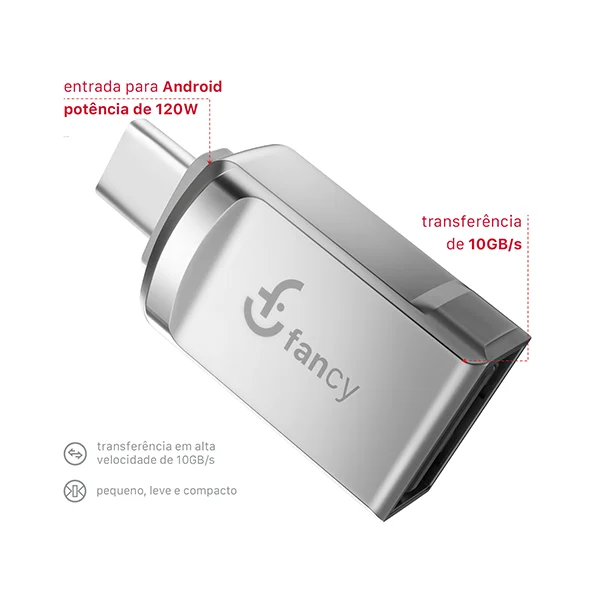O Adaptador OTG AD09 da Fancy oferece alta velocidade de transferência de dados de até 10 Gbps, permitindo conexão com HDs externos, pen drives, teclados, mouses e outros dispositivos USB via entrada Type-C.