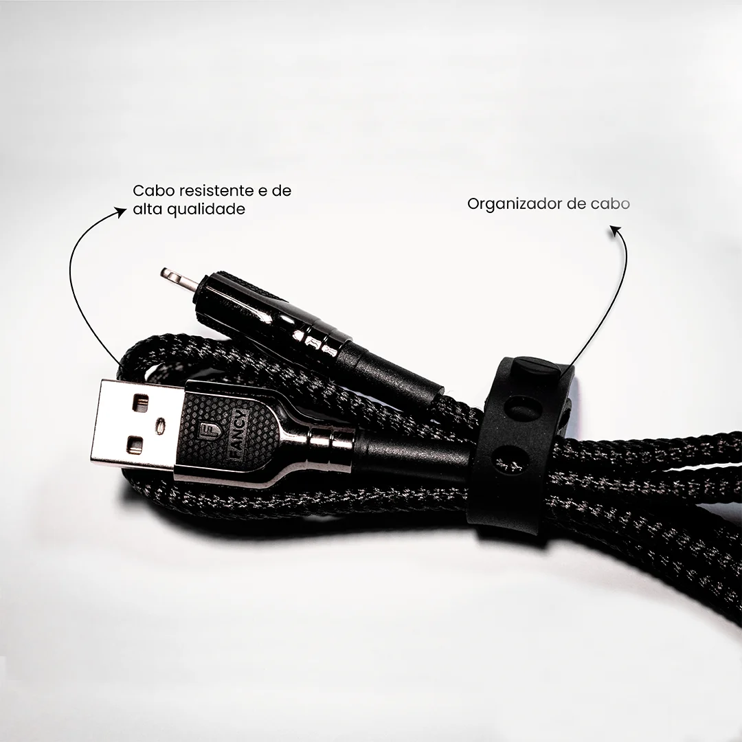 O Cabo Lightning CA321 da Fancy é trançado em nylon reforçado, oferecendo maior resistência e durabilidade em comparação aos cabos tradicionais emborrachados. Com carregamento rápido e chip inteligente, ele garante eficiência e segurança para seus dispositivos Apple.