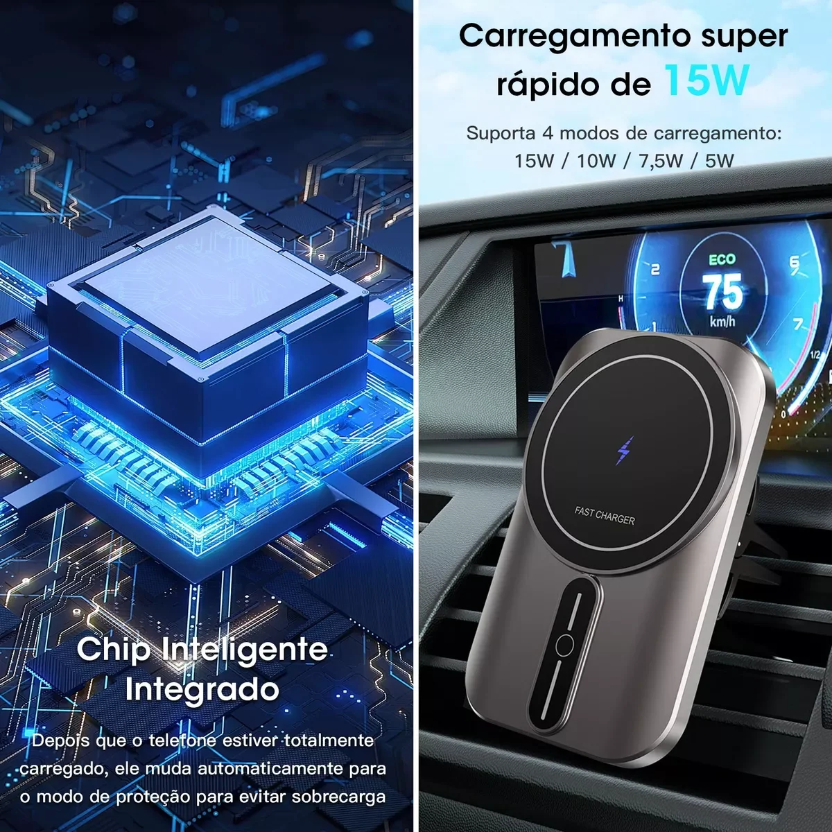 • Potência de 15W: recarga rápida e eficiente