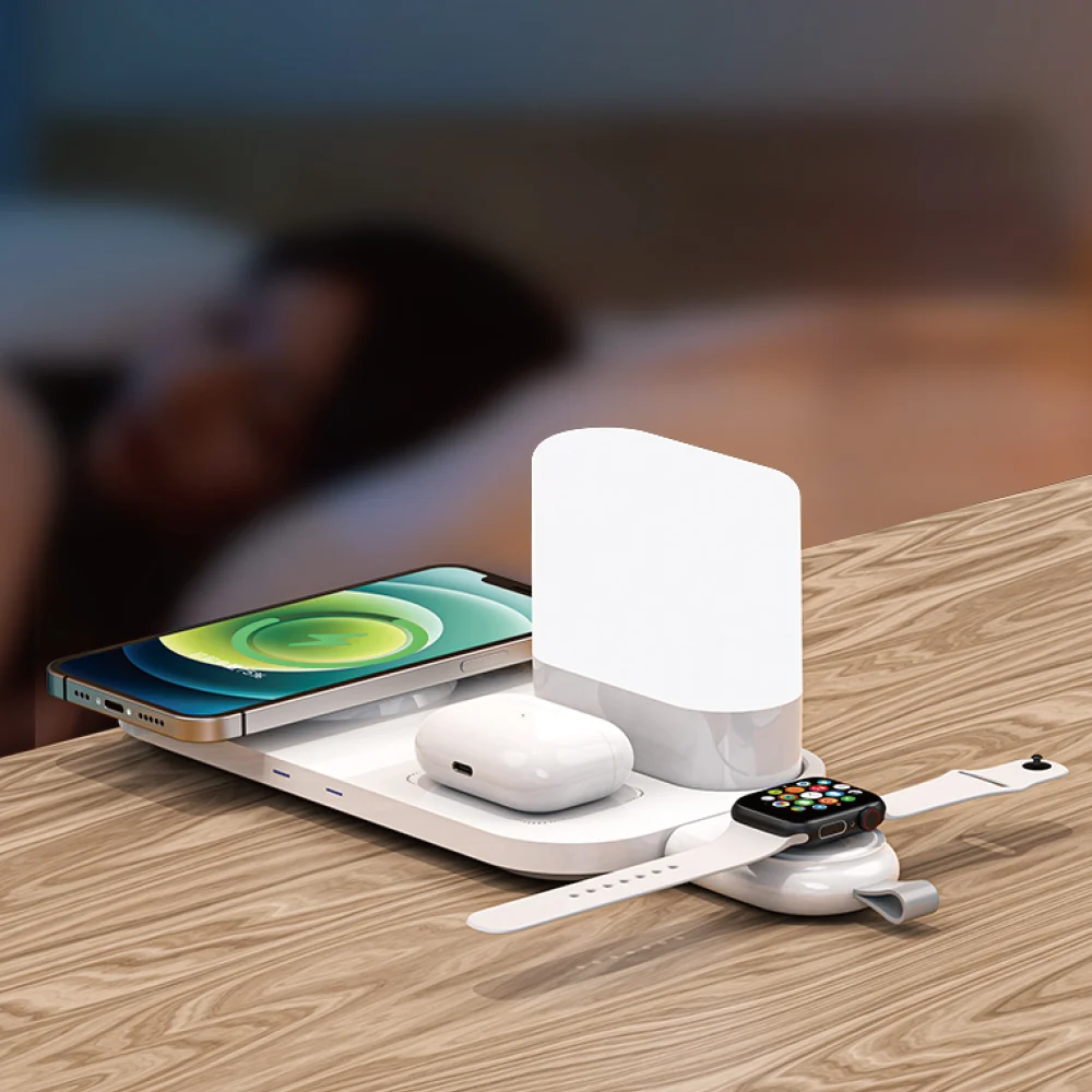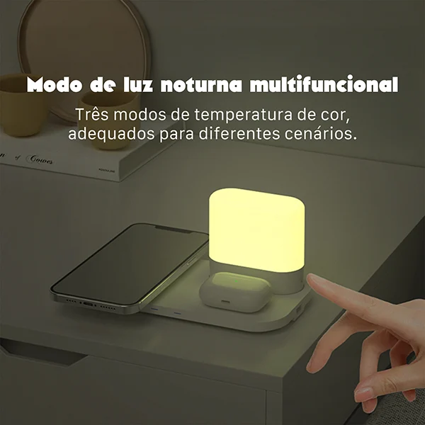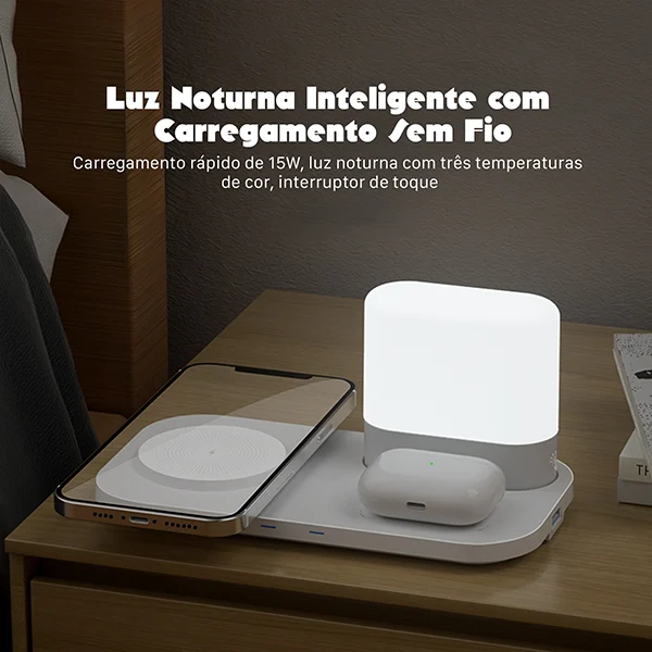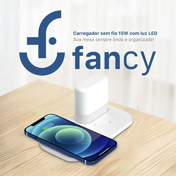 O Carregador Sem Fio 4 em 1 da Fancy é a escolha ideal para quem busca praticidade, organização e um toque de estilo na rotina. Com potência de até 15W e um moderno abajur touch integrado, ele carrega seus dispositivos e ainda decora seu ambiente.