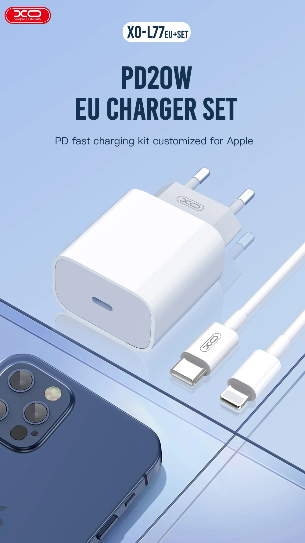 Carregue seu iPhone com mais velocidade e segurança usando o Kit Carregador Turbo PD 20W da XO. Acompanha cabo USB-C para Lightning, compatível com toda a linha Apple com entrada Lightning e suporte a carregamento rápido.