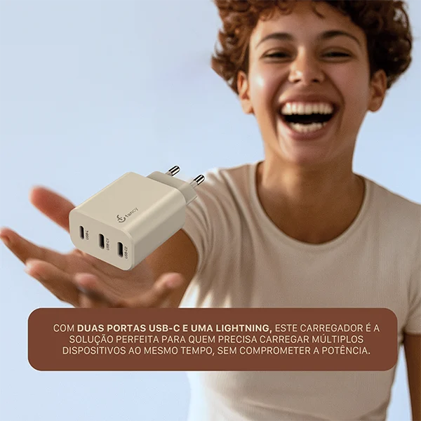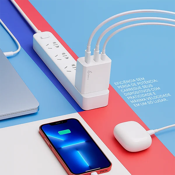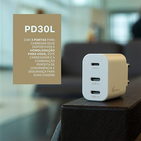 O Carregador GaN Turbo PD30L da Fancy é a combinação perfeita entre potência, tecnologia e praticidade. Equipado com três portas de saída e tecnologia GaN (Nitreto de Gálio), ele oferece carregamento rápido e eficiente para diversos dispositivos, com um design compacto e moderno.