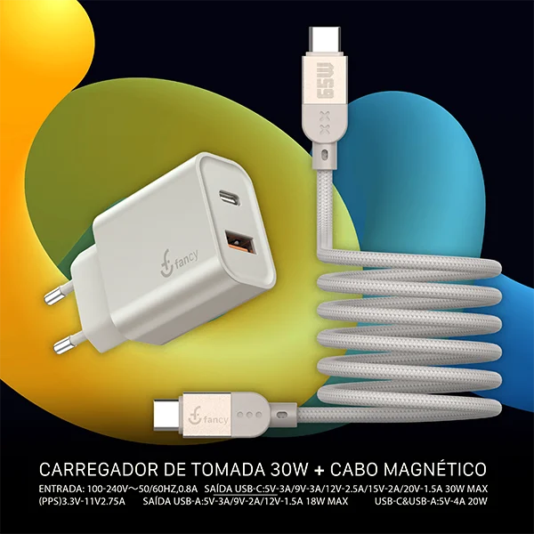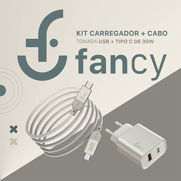O Kit Suprema Titanium Curl PD30T da Fancy combina desempenho, resistência e praticidade. Com um carregador de tomada de 30W e cabo magnético USB-C espiralado de 65W, é a solução ideal para quem busca carregamento ultrarrápido e organização no dia a dia.