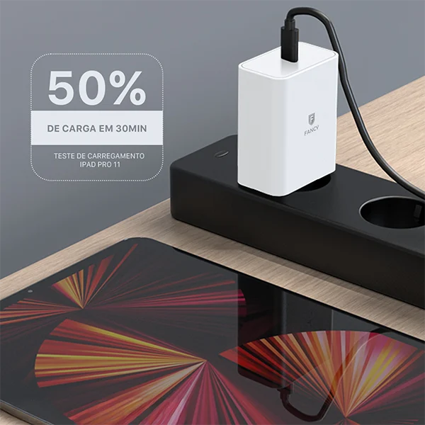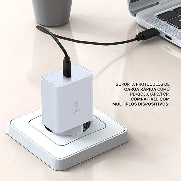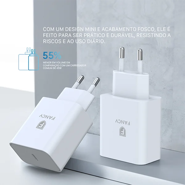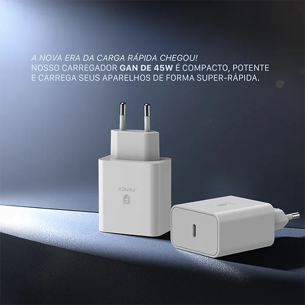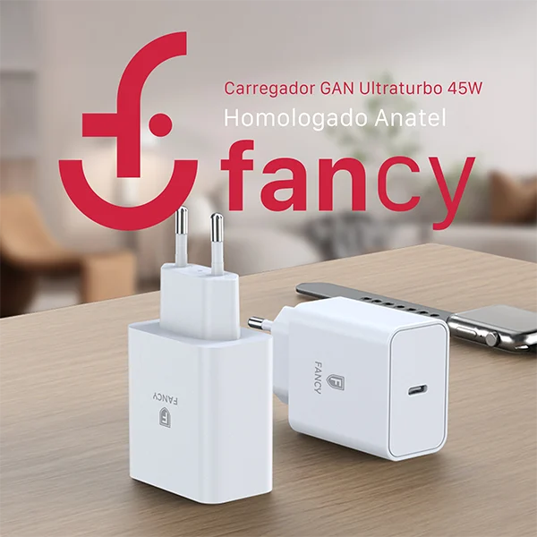 O Carregador UltraTurbo PD45 da Fancy combina tecnologia GaN de alta eficiência com potência de 45W para entregar recargas ultrarrápidas e seguras. Com design compacto e homologação Anatel, é ideal para smartphones, tablets, notebooks e outros dispositivos compatíveis com USB-C e Power Delivery.
